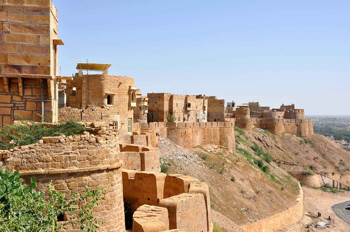 Construit en 1156 par le souverain Rajput Jaisal, ce fort fut au centre de guerres intensives entre les Moghols, basés à Delhi, mais aussi contre les dirigeants de Jodhpur. Ce fort est l’un des deux plus anciens du Rajasthan. Il culmine à 76 mètres de haut et est renforcé par d’imposants murs crénelés de 9 mètres de haut ceinturant le fort sur 5 km.Le fort abrite plusieurs monuments remarquables comme le Palais Royal, « Raj Mahal » et les temples jaïns. Le lieu est calme, même si 3 000 personnes vivent encore dans ces murs.